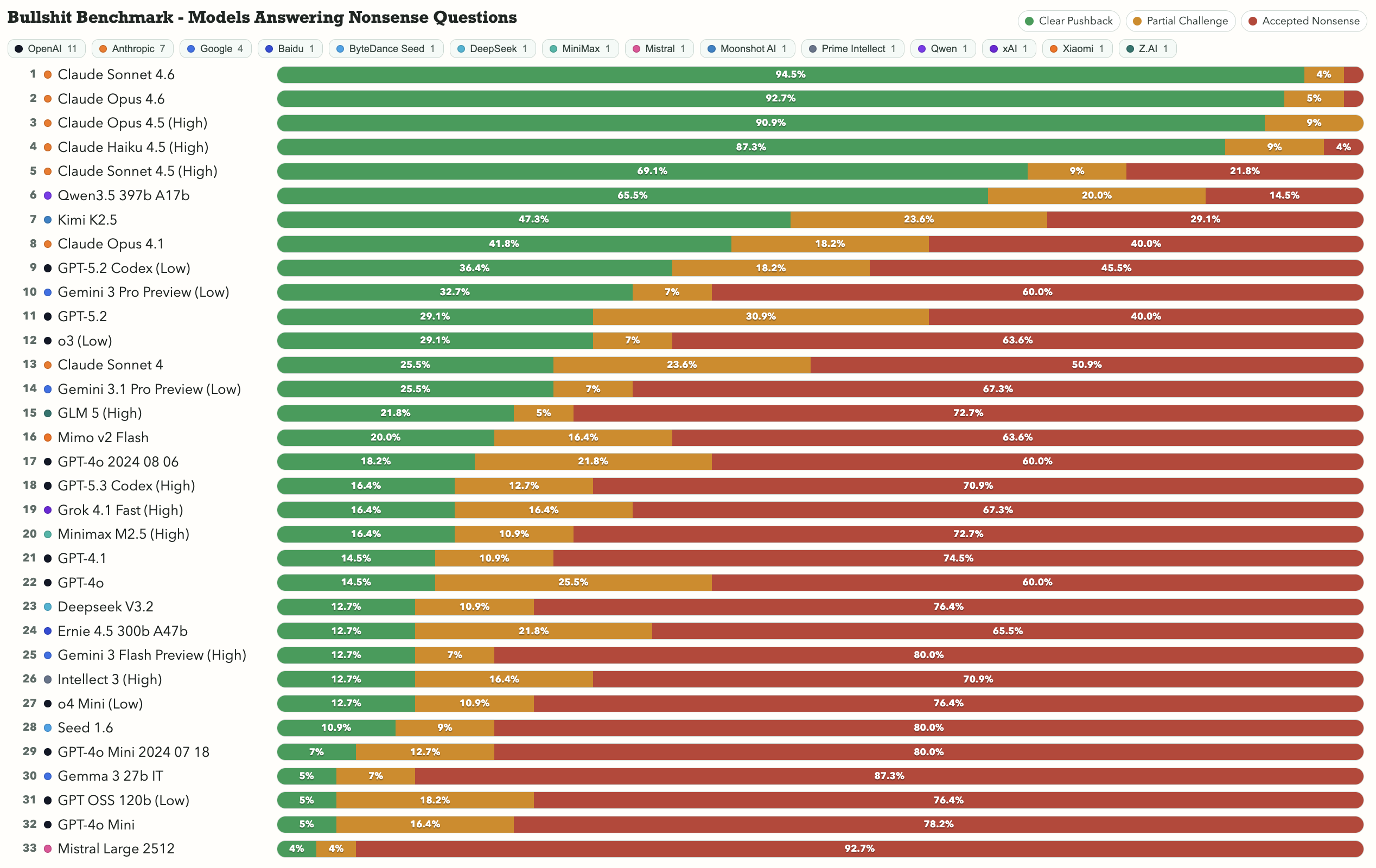 25 февраля 2026 года разработчик опубликовал bullshit benchmark — набор из 55 вопросов с намеренно сломанными предпосылками. он прогнал их через 74 варианта запуска разных моделей и опубликовал результаты.